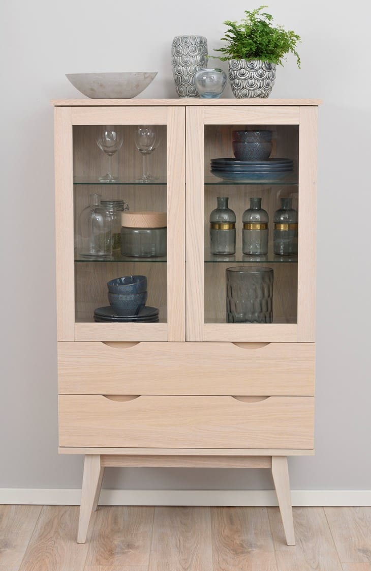 Filippa vitrin i vitpigmenterad lackad ek är ett elegant sätt att visa glas, porslin eller samlarobjekt. Flyttbara hyllplan i härdat glas, mjukstängande dörrar och lätt vinklade ben ger både funktion och modernt uttryck. 140 cm hög – lagom att placera mot vägg eller som solitär.