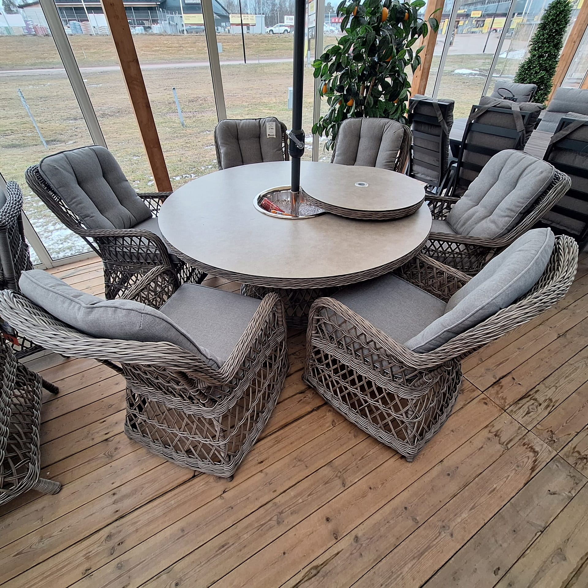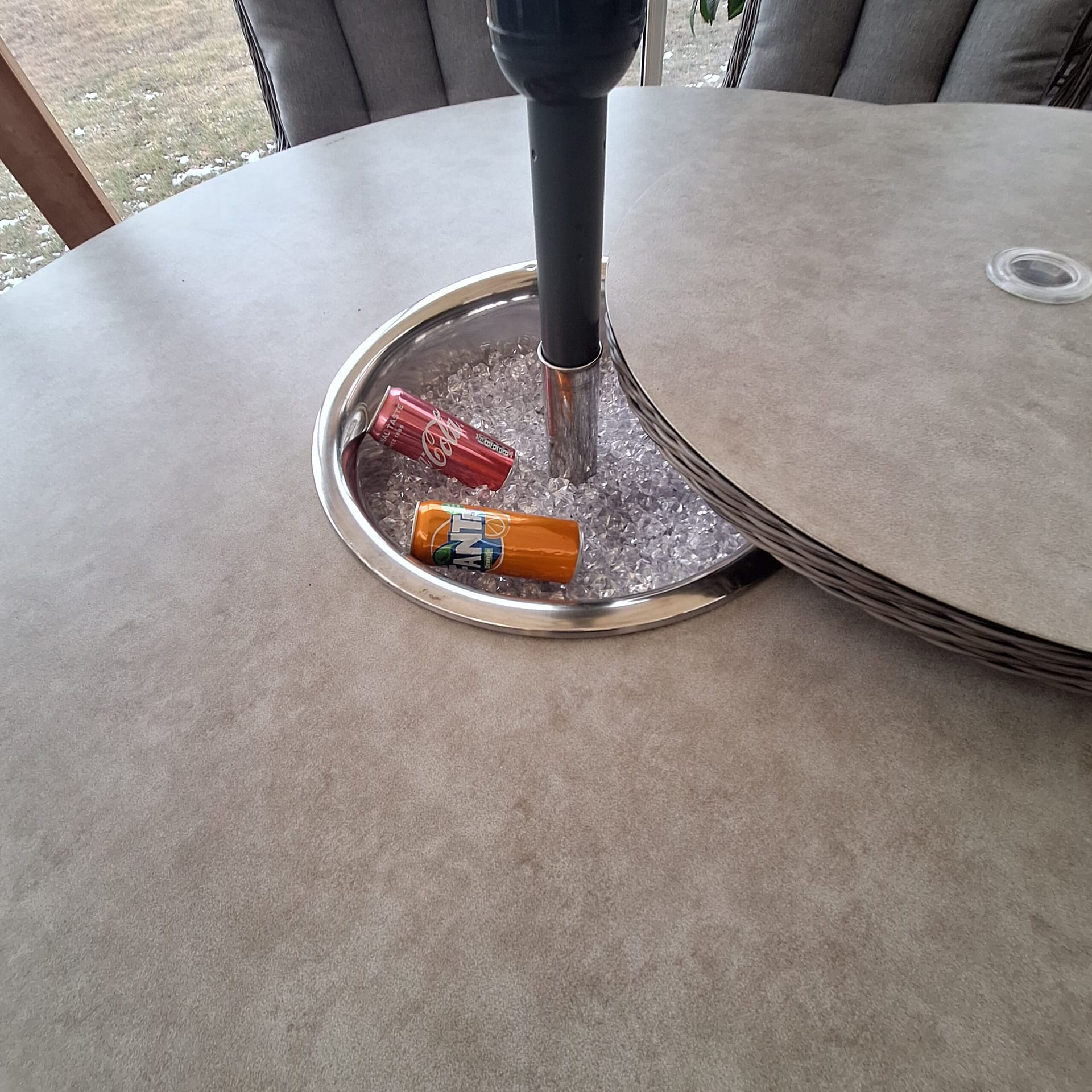 Inbyggd ishink, kan täckas över med medföljande snurrskiva, hål finns för parasoll