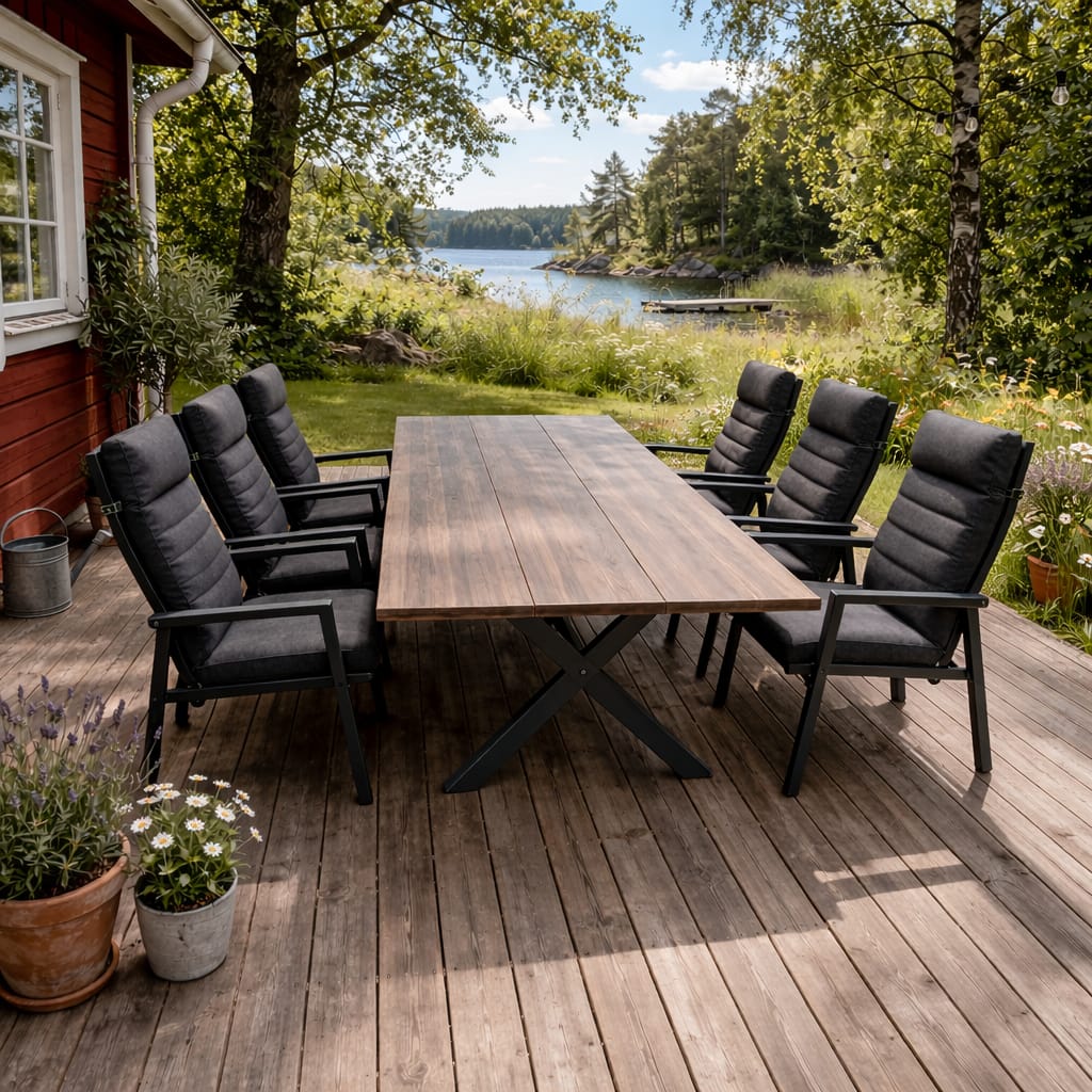 Stilrent utebord med bordsskiva i aintwood och stomme av pulverlackad aluminium. Aintwood ser ut som trä men är helt underhållsfritt och tål både regn och sol. Rymliga 200×100 cm ger plats för sex till åtta personer.