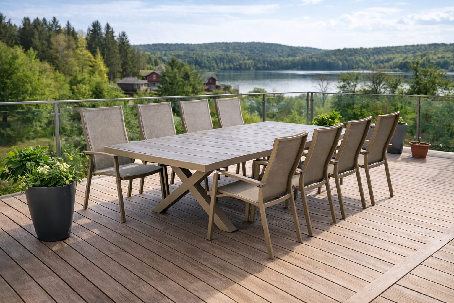 Modernt utebord med slitstark klinkerskiva och stomme i pulverlackad aluminium. Utdragbart från 202 till 262 cm — rymmer upp till tio gäster vid fullt utdrag. UV-skyddad yta i tidlös antracitfärg.