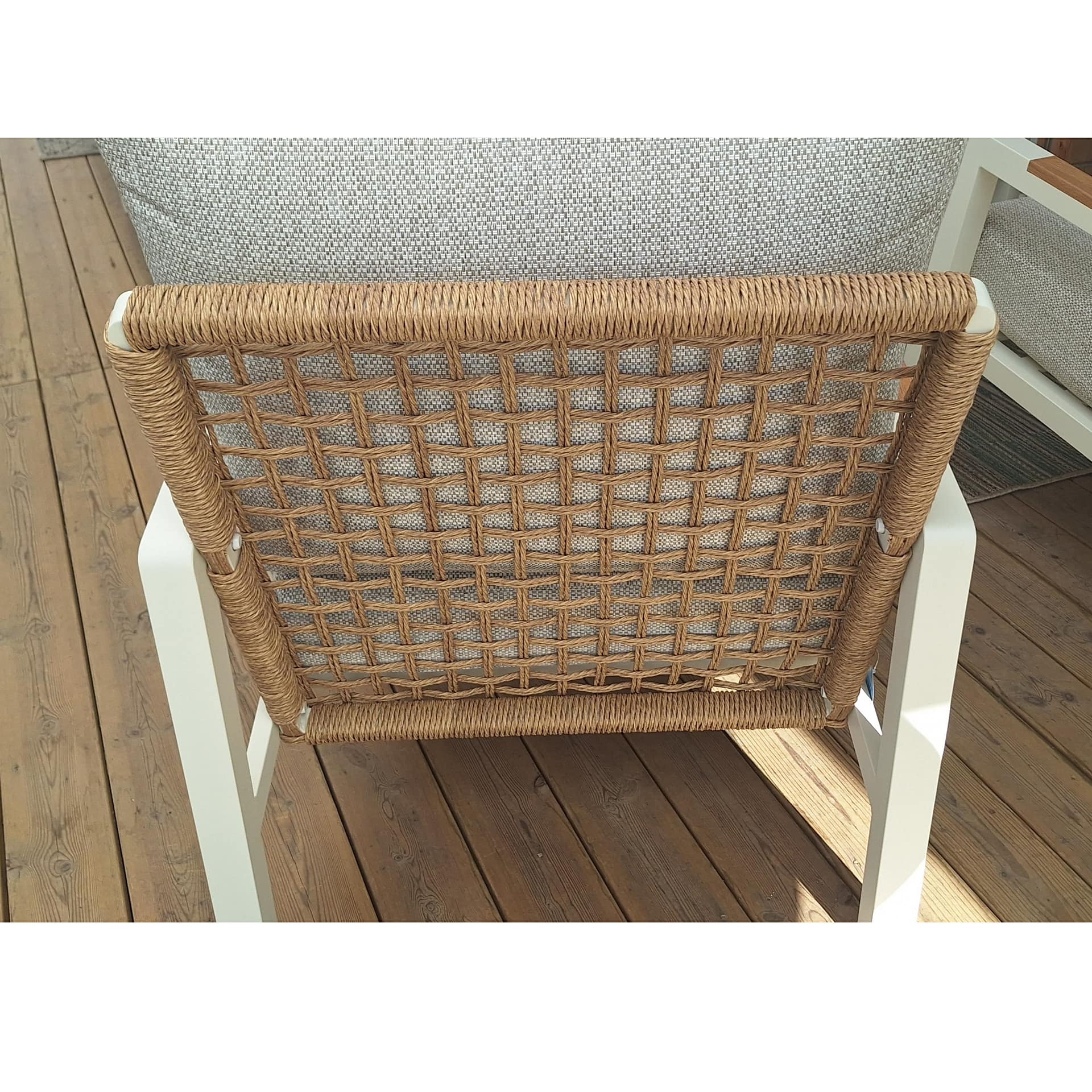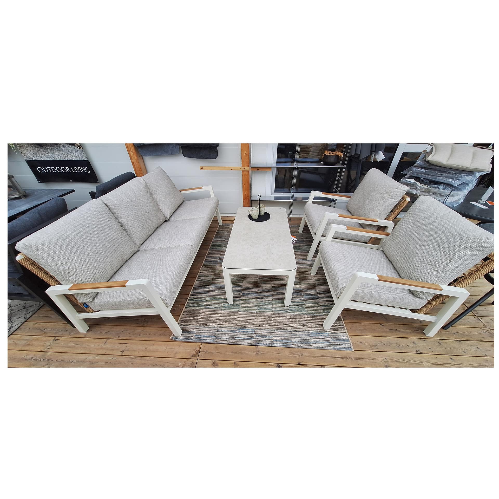 Verona 3+1+1+bord ink dynor i vattenavvisande tyg, vitmålad aluminium/konstrotting, med teakdetaljer på armstöd!
